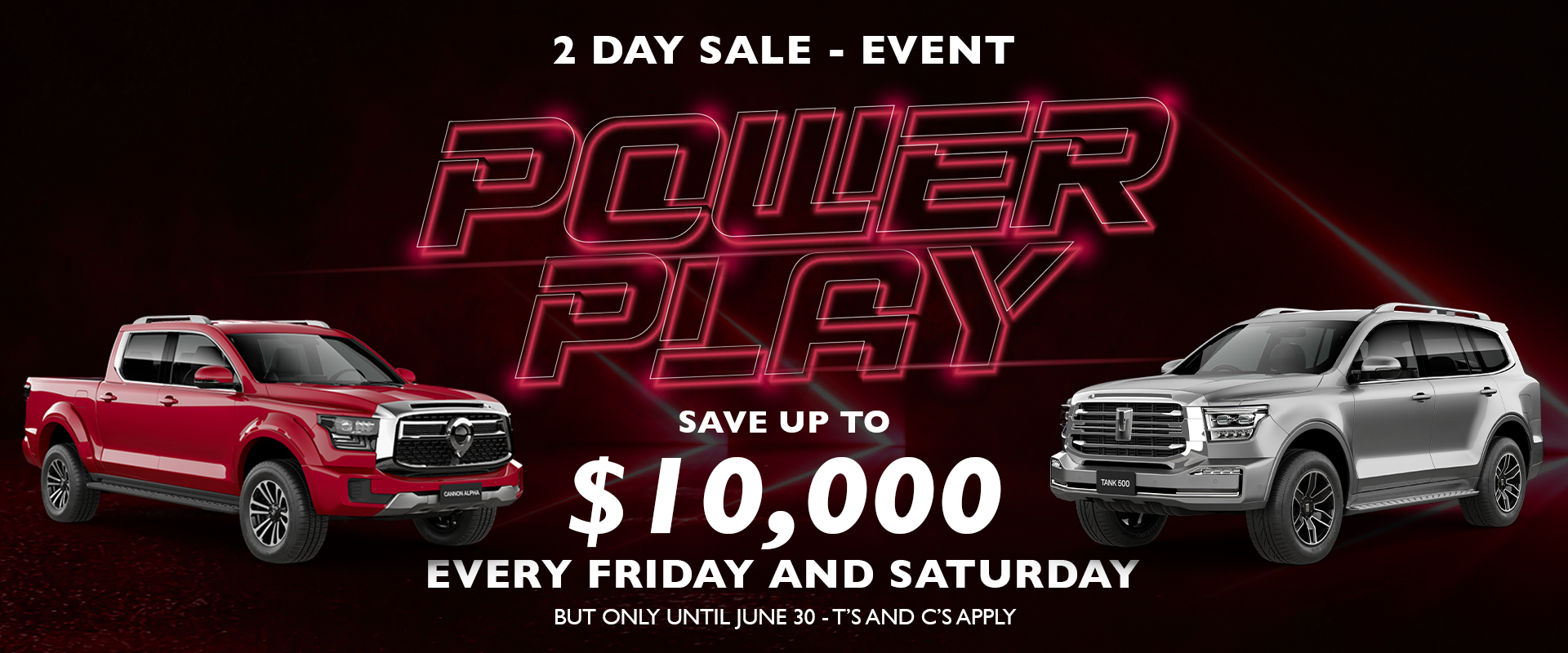 *Terms and conditions apply: The June Power Play Sale is valid from Friday the 30th May through to the 30th June, only at Southport GWM & Pickering Automotive Group, 1 Bailey Cres, Southport, QLD. Offers apply exclusively to registered demonstrator vehicles in stock, while supplies last, and are available on a first-come, first-served basis. Savings of up to $10,000 off are based on selected models and vary by vehicle; not all vehicles will receive the maximum discount. All transactions must be initiated on the sale day to qualify. Appointments are essential, and walk-ins will be accommodated only if time and stock permit. No rain checks or hold requests will be accepted. On-the-spot trade-in valuations are available and subject to vehicle condition and inspection. Finance is offered to approved applicants only; terms, fees, and lending criteria apply. All pricing is correct at the time of publication but may change without notice. Southport GWM & Pickering Automotive Group reserves the right to modify or withdraw any part of this promotion without prior notice. Please call us on (07) 5531 0144 for more information.
